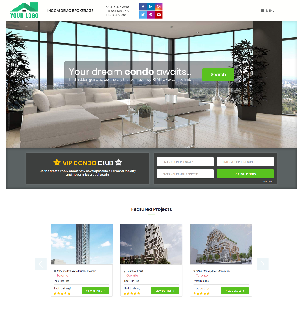 Class: Premium Premium themes are an additional $4.95/m. This grants you access to ALL Premium website designs that add a modern spin to your real estate website. Plus, you can jump from one theme to another.Want to focus your business on targeting pre-construction condo buyers in your local area? No problem. Step up your game and show your competition how it's done. Stand out from the growing crowd and place the spotlight on you with a website that focuses on listings unavailable anywhere else!