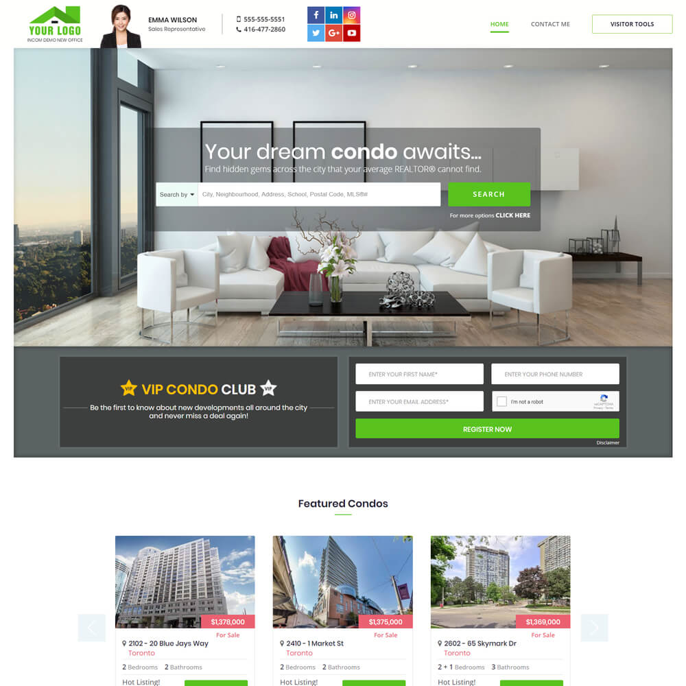 Class: Premium Premium themes are an additional $4.95/m. This grants you access to ALL Premium website designs that add a modern spin to your real estate website. Plus, you can jump from one theme to another.Condominiums become part of a journey, and exploring your website turns into a one-of-a-kind experience. With the ability to select which projects to showcase, this theme is a great tool for building location-based condo directories, a project-specific database, and much more.